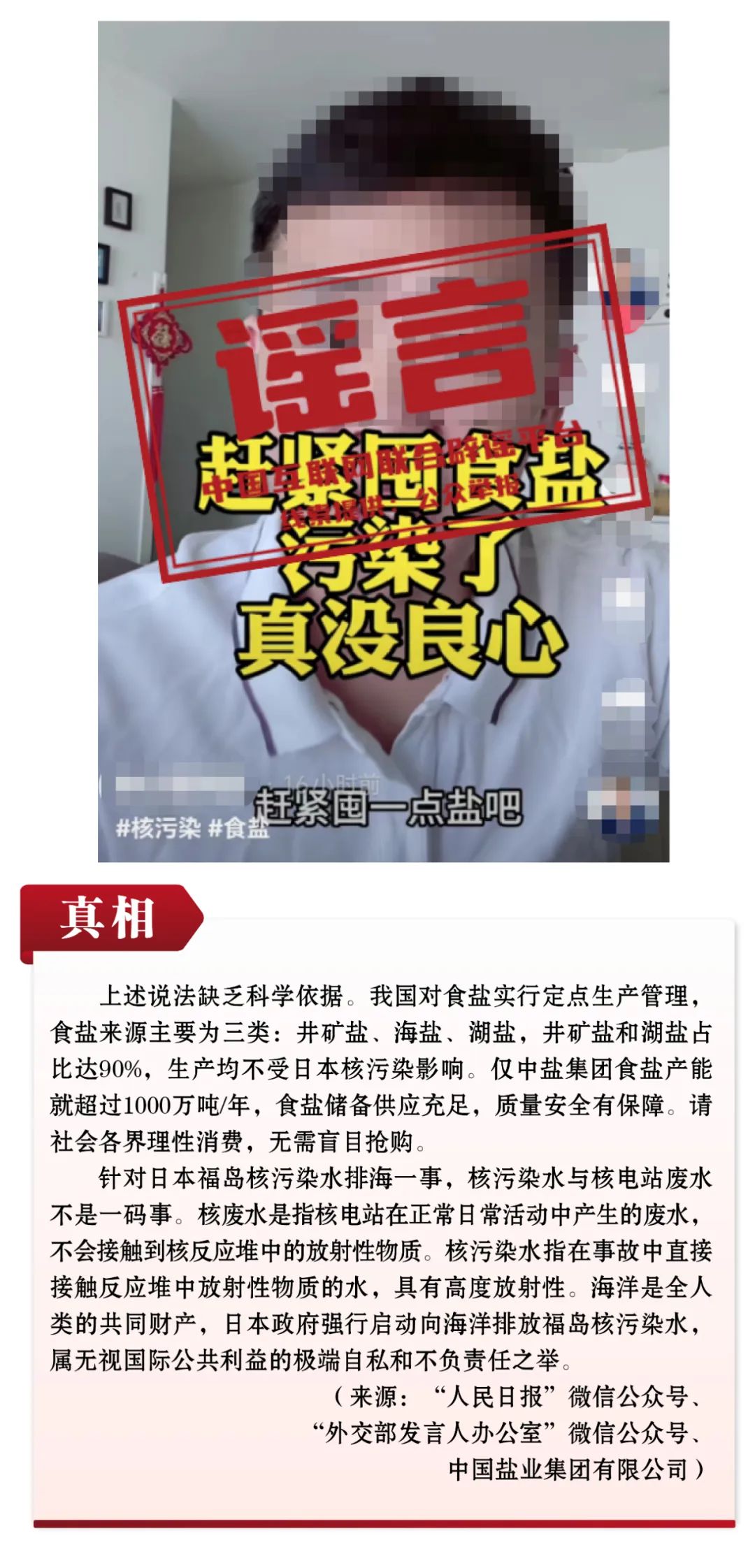 ??炒作社會熱點,造成負面影響。8月,社會熱點話題頗多,一些自媒體利用公眾對社會熱點事件的關心,夸大事實甚至惡意炒作,對社會造成較大負面影響。如日本政府不顧國內外堅決反對,悍然啟動核污染水排海,食品安全問題隨之備受關注。有人為發不義之財,趁機散布“福島核污染水排海,食用鹽不安全”等不實信息,誘導不明真相群眾跟風搶鹽囤鹽,嚴重擾亂正常市場秩序。緬北電信詐騙話題熱度持續升高之際,有人編造傳播“重慶某公司以出國團建之名將員工騙至緬北”謠言,惡意炒作、制造恐慌,造成不良社會影響。此外,“深圳出現大量斷供房”“青島火車站停運”等不實信息或夸大其詞,或無中生有,企圖吸引眼球、博取關注,影響社會信任。
