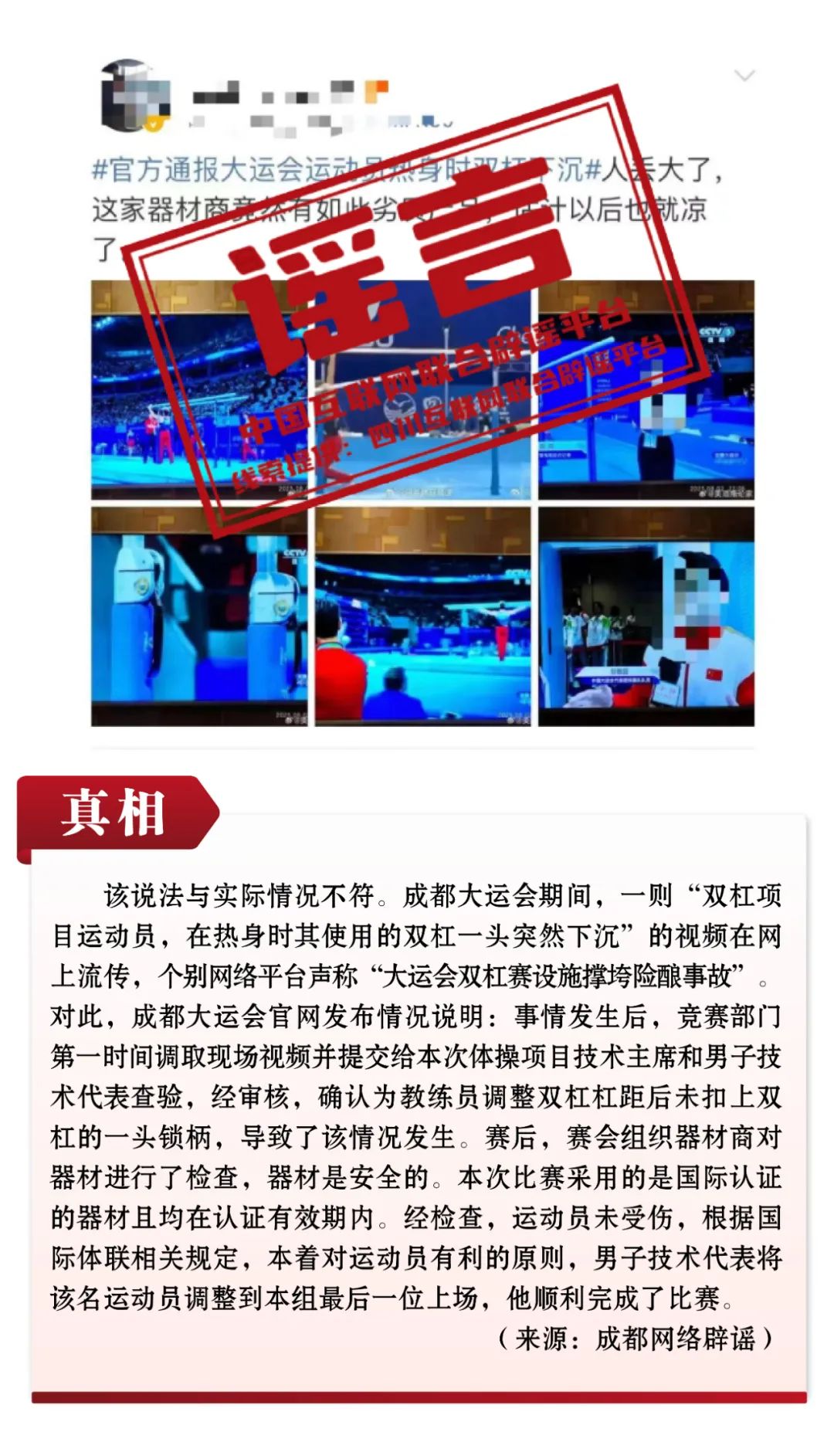 ??謠言8:成都大運會雙杠賽設施撐垮險釀事故?