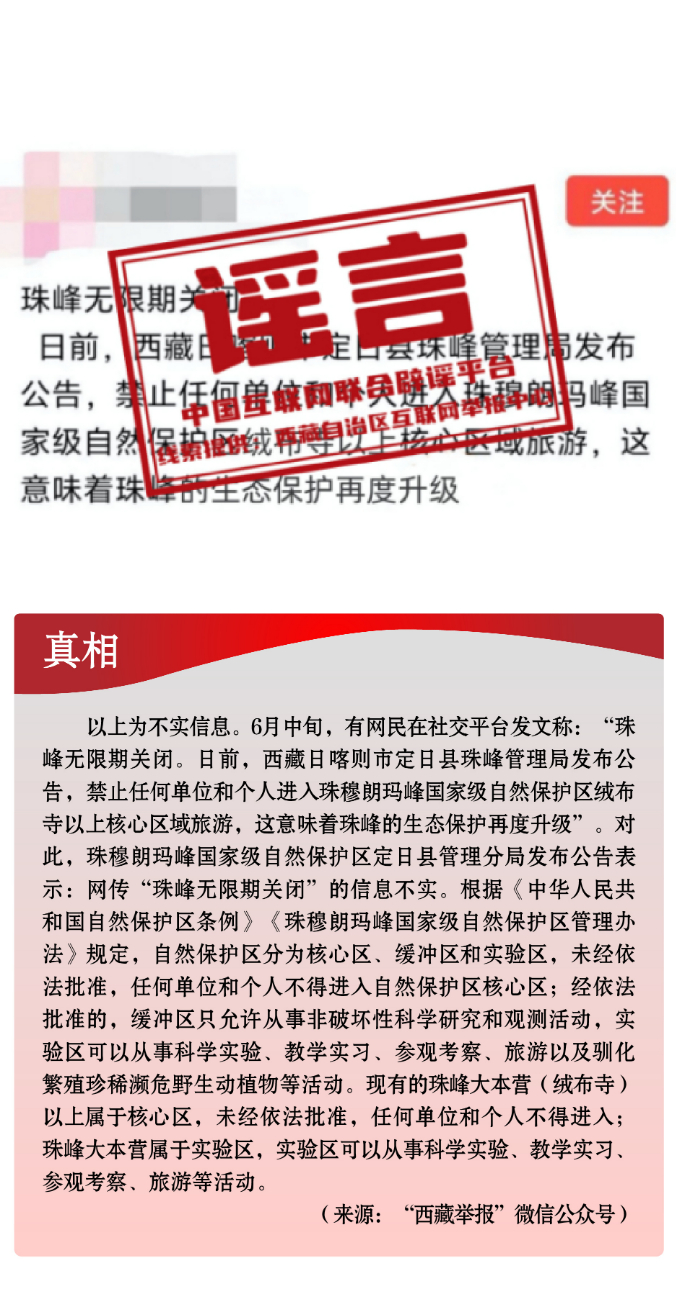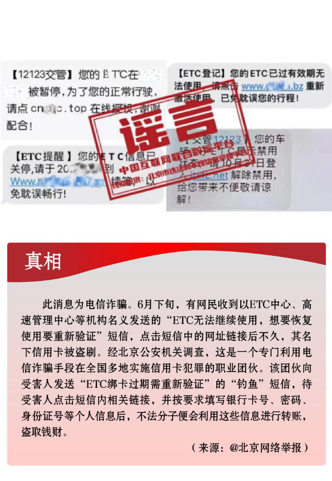 ??旅游出行類謠言增多,擾亂公眾視聽。6月,暑期臨近、旅游旺季將至,涉及旅游出行等謠言信息亦隨之增多。謠言“去云南旅游每人補(bǔ)貼3169元”嚴(yán)重歪曲云南旅游政策,純屬虛假宣傳、誘騙公眾;謠言“ETC綁卡過期需重新驗(yàn)證”實(shí)為不法分子精心設(shè)計(jì)的詐騙“釣魚短信”;謠言“珠峰無限期關(guān)閉”“商家為賺補(bǔ)胎錢在獨(dú)庫公路撒釘子”或誤解誤讀、或歪曲炒作,引發(fā)公眾對當(dāng)?shù)匚穆脴I(yè)的擔(dān)憂和困擾。
