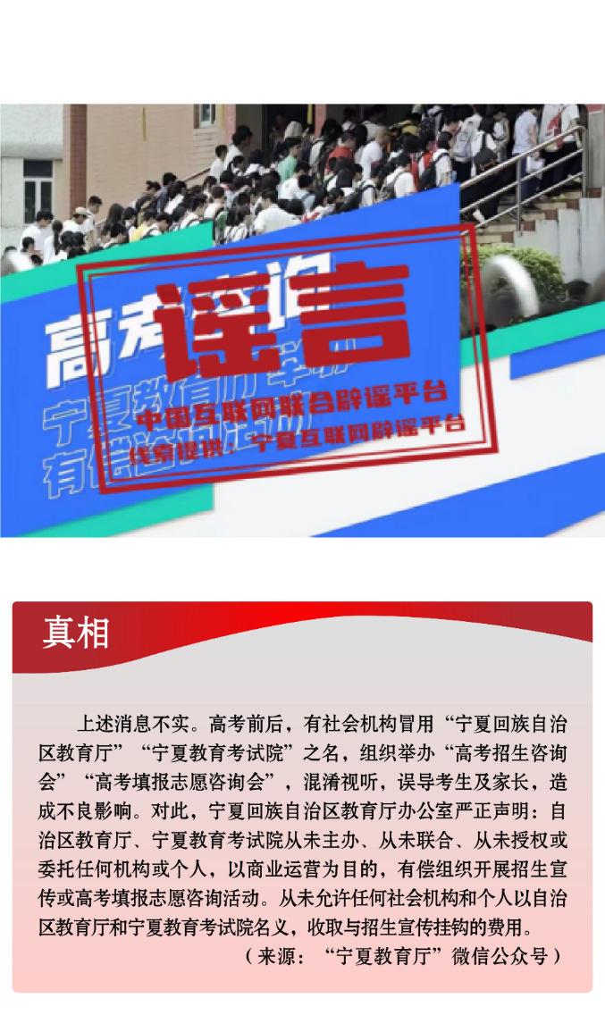 ??涉高招中招類謠言多存詐騙風(fēng)險(xiǎn),侵害群眾利益。6月,中、高考落幕,畢業(yè)季開啟。隨著高招中招、求職招聘等話題日漸成為熱點(diǎn),相關(guān)謠言也潛滋暗長。一些社會機(jī)構(gòu)抓住考生和家長“上岸”心切的心理,借機(jī)杜撰欺詐“臺詞劇本”,企圖行騙牟利。如冒用官方名義發(fā)布“某地教育廳舉辦高考招生及志愿填報(bào)有償咨詢活動”“某大學(xué)向考生發(fā)送‘降分錄取協(xié)議書’”“某地2024中考成績已出”等通知、公告,實(shí)際均為不法分子編造的詐騙套路,誤導(dǎo)考生和家長。又如,有機(jī)構(gòu)和個(gè)人利用社交媒體、網(wǎng)站推送“只要繳納高額費(fèi)用,就能‘包過’職稱評審”等虛假消息,利用個(gè)別求職人員想“走捷徑”心態(tài),實(shí)施欺詐,企圖從中收取所謂“服務(wù)費(fèi)”“代辦費(fèi)”“咨詢費(fèi)”等費(fèi)用。還有個(gè)別網(wǎng)民編造涉考場秩序的不實(shí)信息,如“某地幾所中學(xué)的中考存在作弊情況”“某地一考生考試中多次扭頭成績被判0分”等謠言,純屬子虛烏有,擾亂招考秩序。