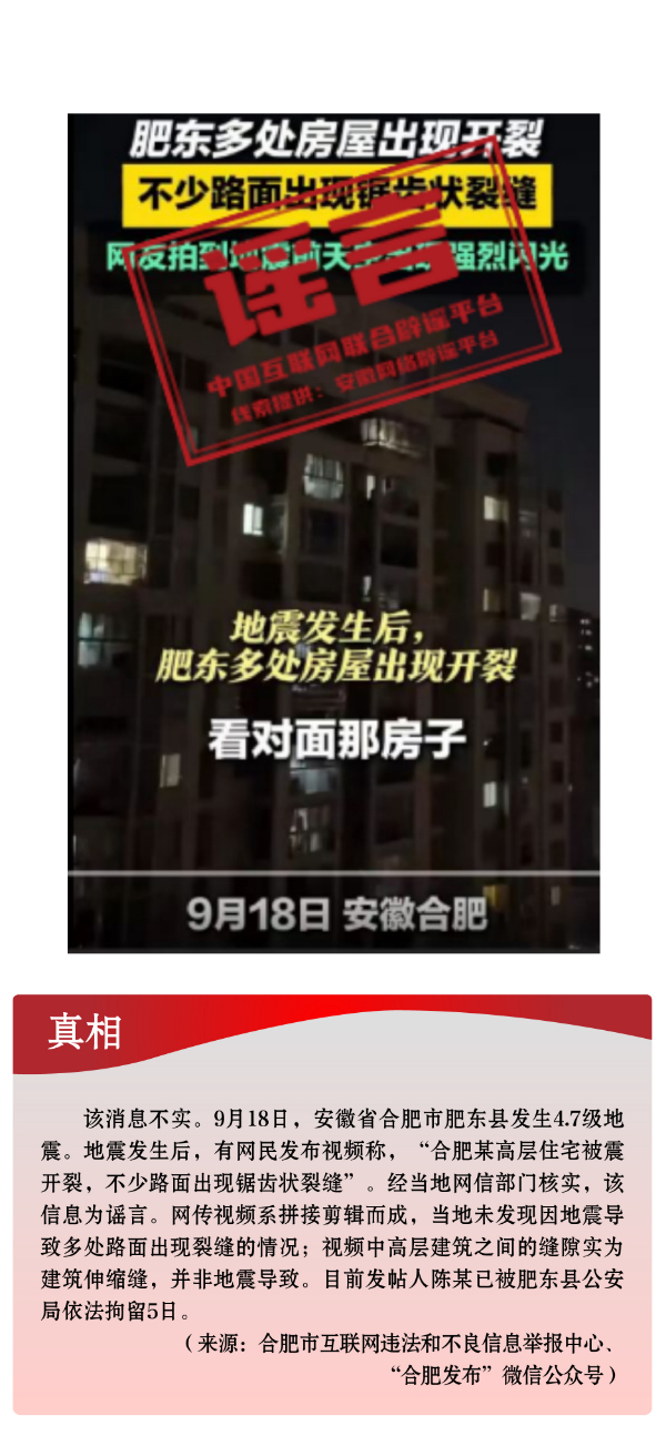 ??炒作災(zāi)害事故制造焦慮。9月,臺風(fēng)“摩羯”“貝碧嘉”接連來襲,全國多地災(zāi)情嚴(yán)峻;安徽、新疆等部分地方發(fā)生地震,威脅民眾生命財(cái)產(chǎn)安全。個(gè)別自媒體和網(wǎng)民為博取關(guān)注、吸引流量,或夸大其詞,或張冠李戴,或移花接木,借機(jī)編造發(fā)布“臺風(fēng)天海南有醫(yī)務(wù)人員被砸死”“上海有人因臺風(fēng)被吹落高墜”“廣東某石材城牌坊被臺風(fēng)吹倒”“臺風(fēng)‘摩羯’致廣西多地‘一片狼藉’”等不實(shí)信息,引發(fā)群眾恐慌,造成不良社會影響。謠言“合肥肥東地震導(dǎo)致高層住宅出現(xiàn)裂縫”系拼接剪輯視頻而成,蓄意歪曲事實(shí);“重慶市沙坪壩區(qū)突發(fā)7級地震”則純屬子虛烏有。此外,一些網(wǎng)民刻意杜撰并擴(kuò)散“一冷藏車?yán)锇l(fā)現(xiàn)15名被拐兒童”“重慶江北觀音橋抓人販子”“人販子到廣西貴港市中心抓人”等嚴(yán)重失實(shí)的涉公共安全類謠言,蓄意制造焦慮,擾亂社會秩序。