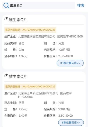 ??第四步:以搜索維生素C為例,可以看到下方展示了在售的相關商品及價格等信息。
